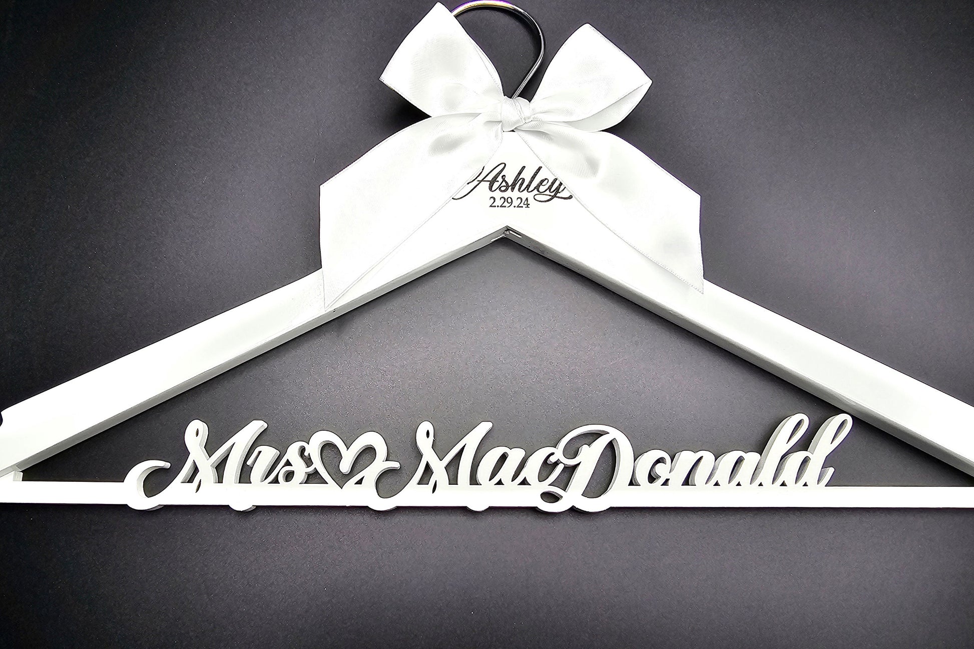 • Custom Engraving: Each hanger includes a "Mrs." name bar, a date bar attached to the hanger, and the first name elegantly engraved on the wood.